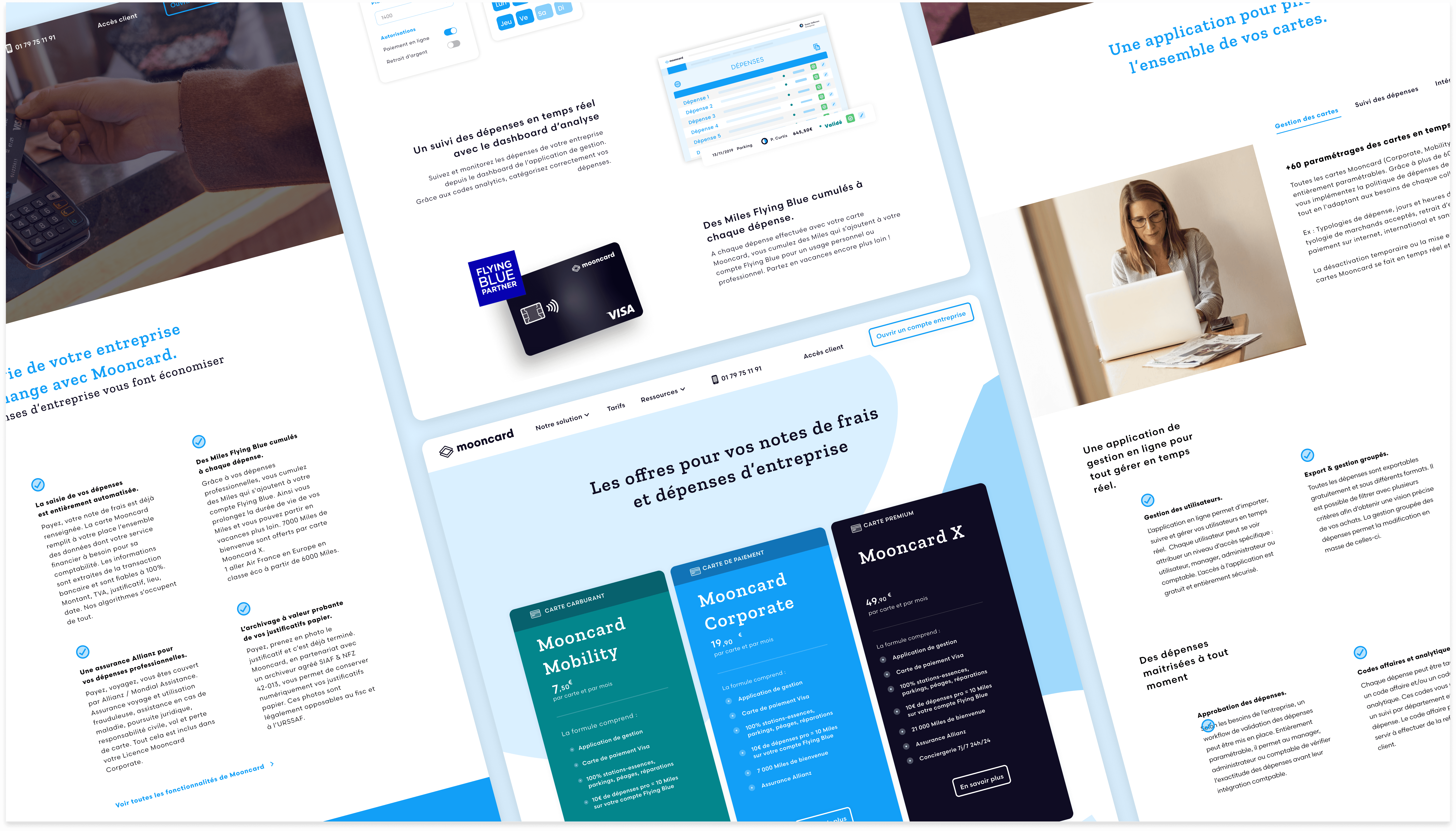 Suite à la réalisation d'une nouvelle charte graphique, la refonte du site était un impératif. C'est à la fois l'accès au logiciel Saas et le point d'entrée des nouveaux leads. Mooncard avait besoin de séduire les visiteurs et de garantir une bonne compréhension de ses offres. Avec l'internationalisation, ce site à été adapté pour couvrir différentes langues (anglais, allemand, espagnol, italien, néerlandais).